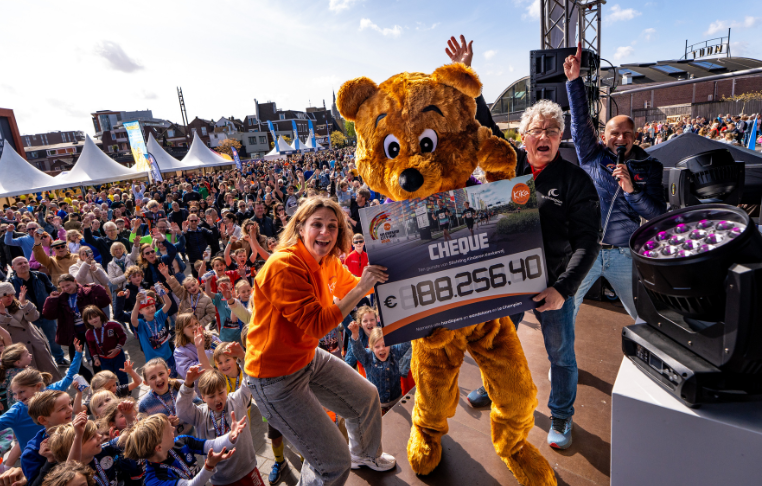 Dankzij alle donaties werd in de middag onder luid gejuich een indrukwekkende cheque overhandigd aan Jakolien van Eijk van KiKa met een fantastisch bedrag van € 188.256,40!